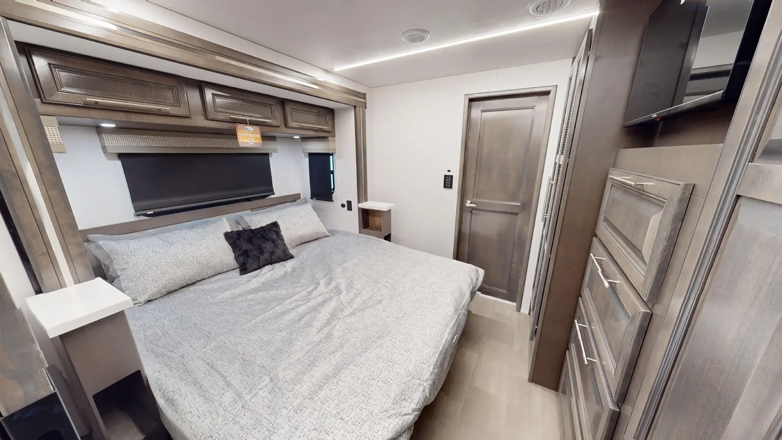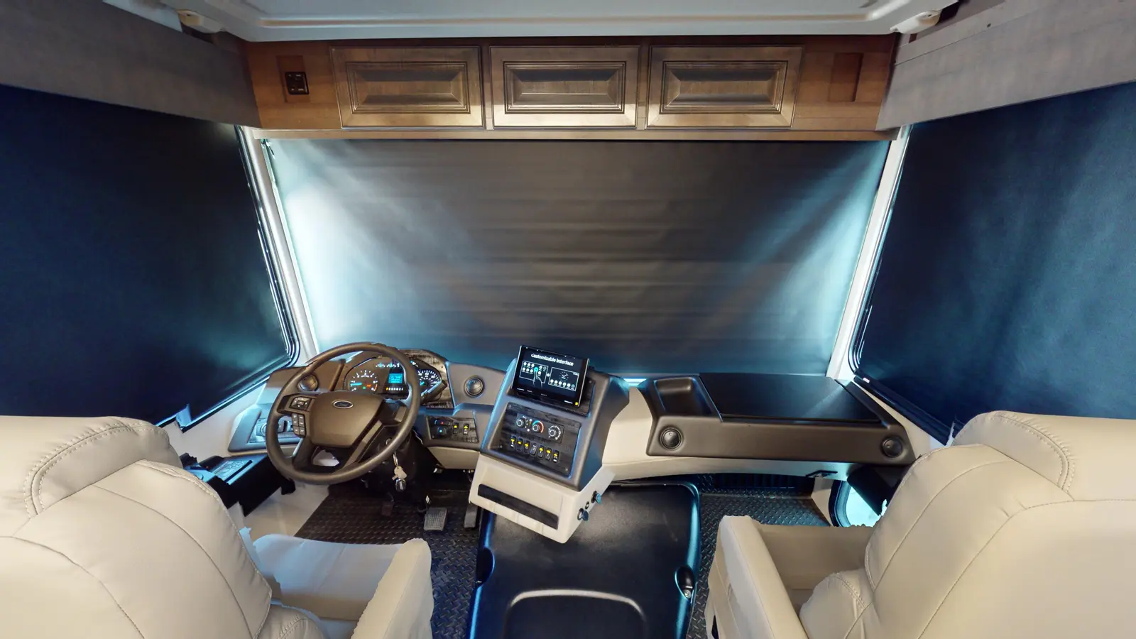 The Georgetown 36K7 by Forest River is designed for family comfort with two full baths and bunks. The kitchen features a farmhouse sink, 3-burner cooktop, microwave, and residential refrigerator. Enjoy entertainment in the theater seats across from a TV. The mid-ship full bath is across from the bunk beds. The bedroom offers a king bed and optional washer/dryer, plus a full master bath. The cab features swivel captain seats, a table, and a power overhead bunk.