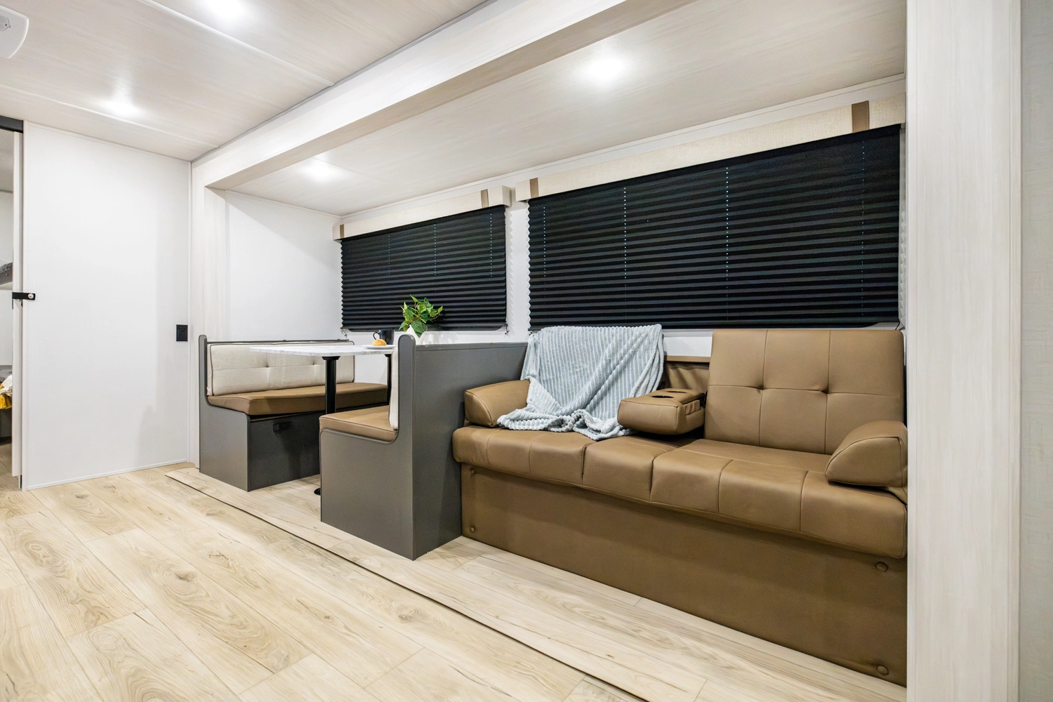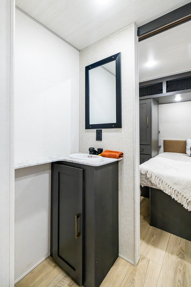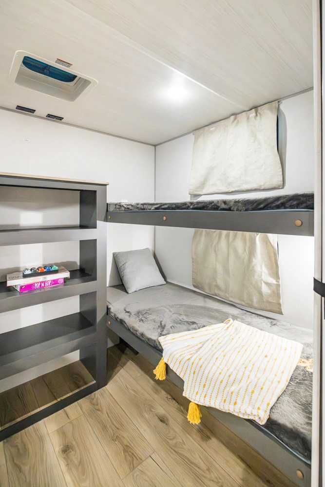The Ibex New Trail Edition TRAIL28 features a front queen bed, central living area with sofa and dinette, a full kitchen, and a walk-through bath. A private rear bunk room offers four bunks and extra storage. Includes washer/dryer prep, tankless water heater, 50-amp service, and designed with superior construction.