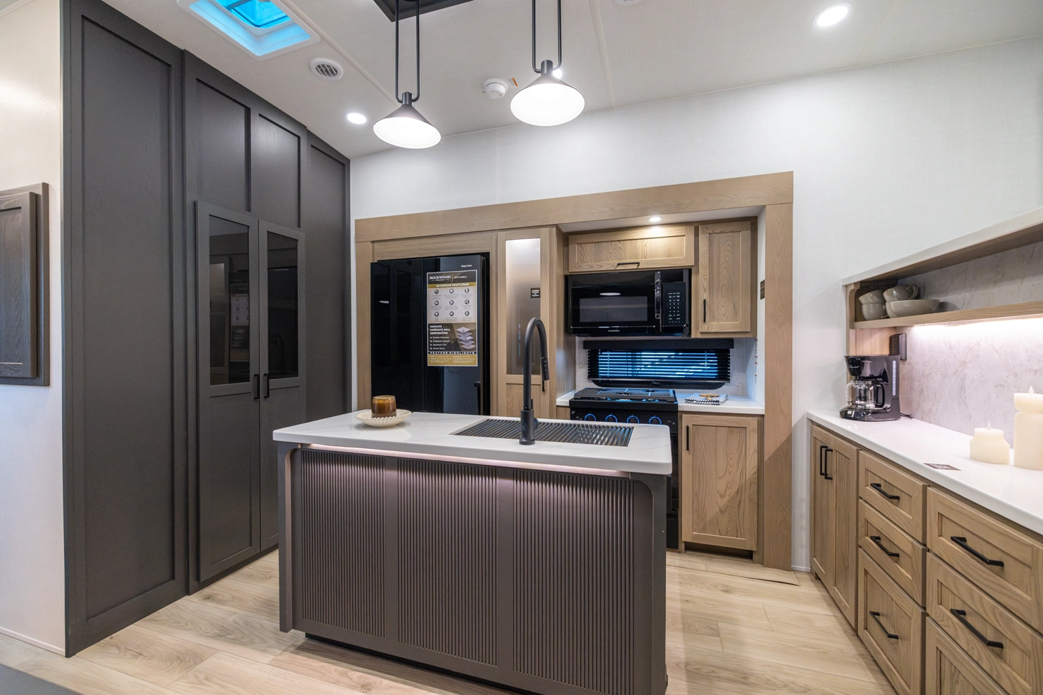 WHEN YOU WISH TO UPGRADE YOUR CAMPING EXPERIENCE, EMBRACE OUR SIGNATURE LINE OF 5TH WHEELS. Elevate your journey with the quintessence of Rockwood's first-in-class quality and exceptional craftsmanship, now augmented by a host of supplementary features to enrich your journey. Anticipate superior offerings such as king-sized beds, effortless electric auto-leveling, exquisite upgraded solid-surface countertops, and the luxury of residential-style soft-close drawers. Every Signature 5th wheel now comes with an option for our power package, propelling you to destinations you once deemed beyond reach.