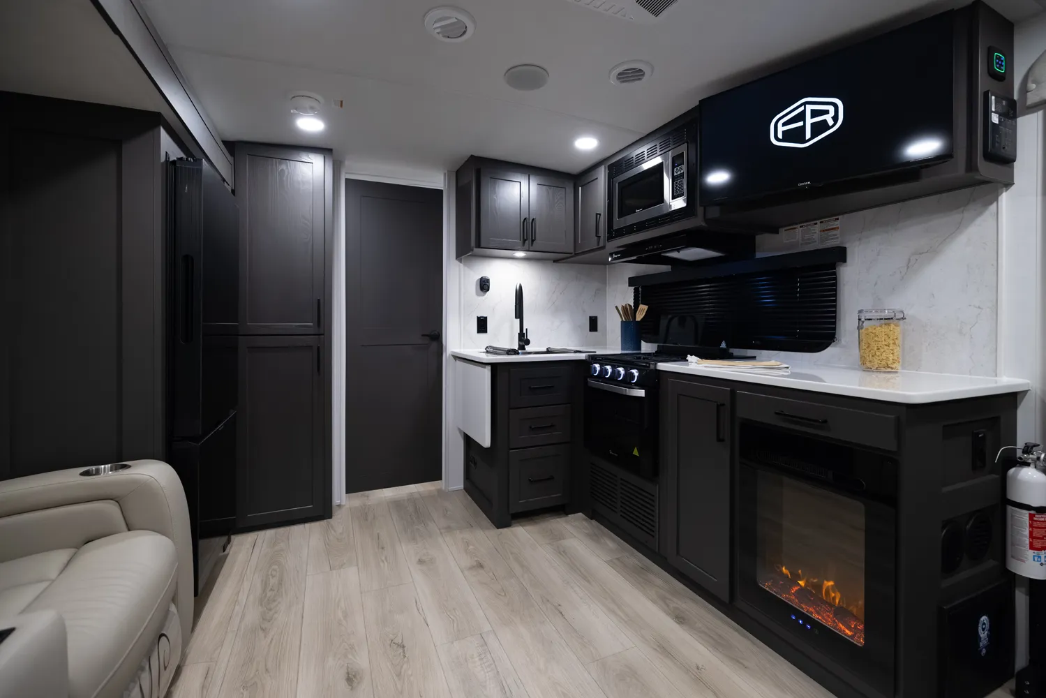 The 2618RD features a front bedroom with a true queen bed and wardrobe slide. Two entry doors provide easy access to the bedroom, large pass-through bathroom, and kitchen even when slides are in. The rear U-shaped dinette and 67" theater seat create a spacious, comfortable living area, making the 2618RD perfect for couples or small families.