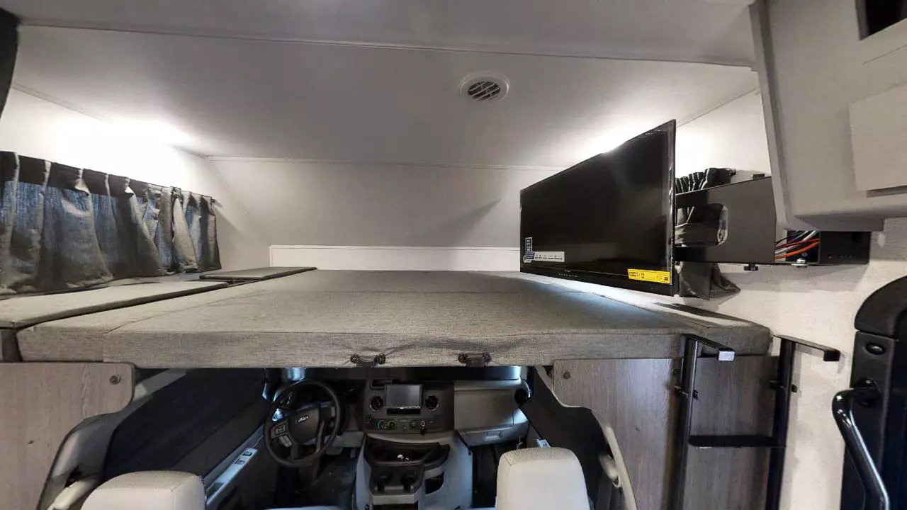 The Solera 22N is built on the Ford E350 chassis. Start traveling in true luxury with this motorhome! The corner queen bed offers a comfortable night's rest, and is conveniently next to the rear corner bathroom which has a 24" x 32" shower and a vanity sink just outside. The kitchen area is fully equipped for meals on the go, with a 10.7 cu ft 12V refrigerator, recessed 3-burner range with flush glass cover, and a 1.3 cu ft convection microwave oven. Overhead cabinets provide ample storage. This model includes the ever-popular U-shaped dinette, which transforms into an extra sleeping space too. The 60" x 80" bunk over cab also offers yet another sleeping spot with LED TV for entertainment.