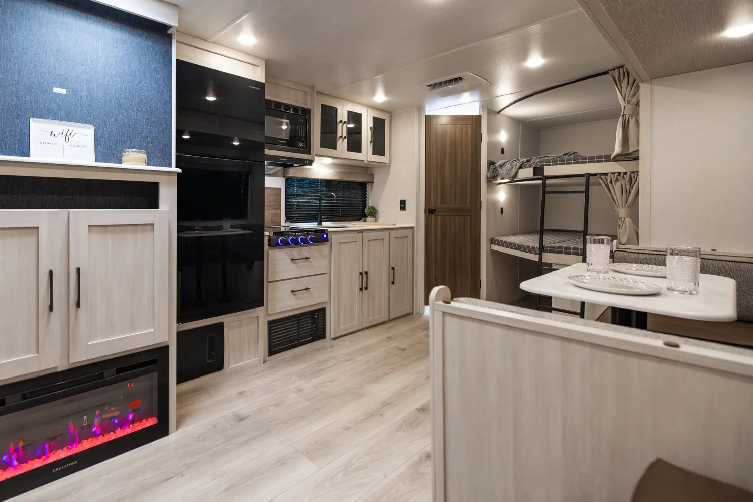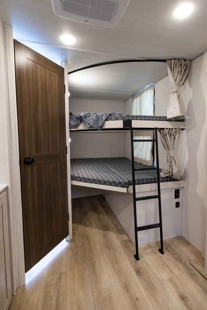 This 33' 4" travel trailer features a front queen bed, a convertible U-shaped dinette, and a rear corner bunkhouse with a ladder-accessible top bunk. The kitchen includes a 10 cu. ft. 12V refrigerator, oven, and stovetop. Exterior amenities include a 19' electric awning, outdoor camp kitchen, and a hot & cold spray port.